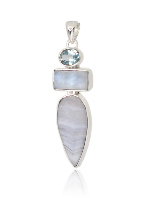 FREEFORM BLUE LACE AGATE/BLUE TOPAZ/MOONSTONE PENDANT SET IN STERLING SILVER, 60 X 15MM.