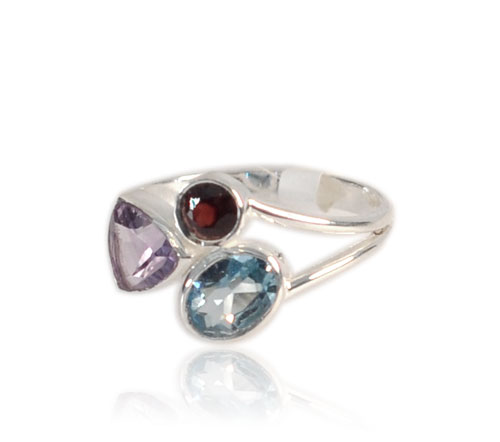 STERLING SILVER MULTI GEMSTONE RING, ( GARNET, AMETHYST, BLUE TOPAZ ).