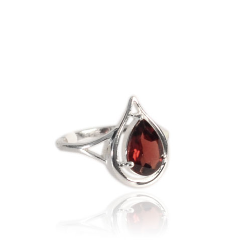 STERLING SILVER RING WITH FACETED DROP SHAPE GARNET.